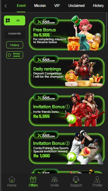 Daily rewards, referral bonuses, and sometimes surprise offers are given to the players. X555 keeps users engaged by offering new promotions and rewards every day.